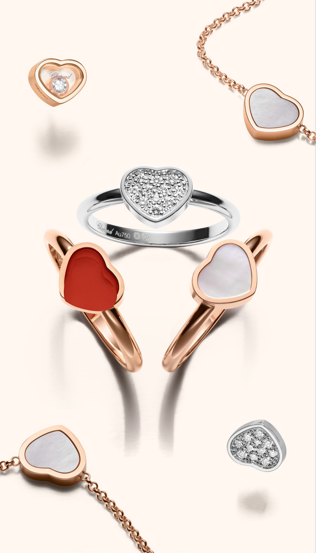 Die Schmuckkollektion My Happy Hearts übernimmt die bekanntesten Designcodes der legendären Chopard-Kreationen: das Herz und die beweglichen Diamanten. Die My Happy Hearts Diamantringe mit den Herzmotiven sind zierliche Schmuckstücke, die als stylishe Accessoires einzeln oder miteinander kombiniert getragen werden können. Me, Myself and My Happy Hearts.