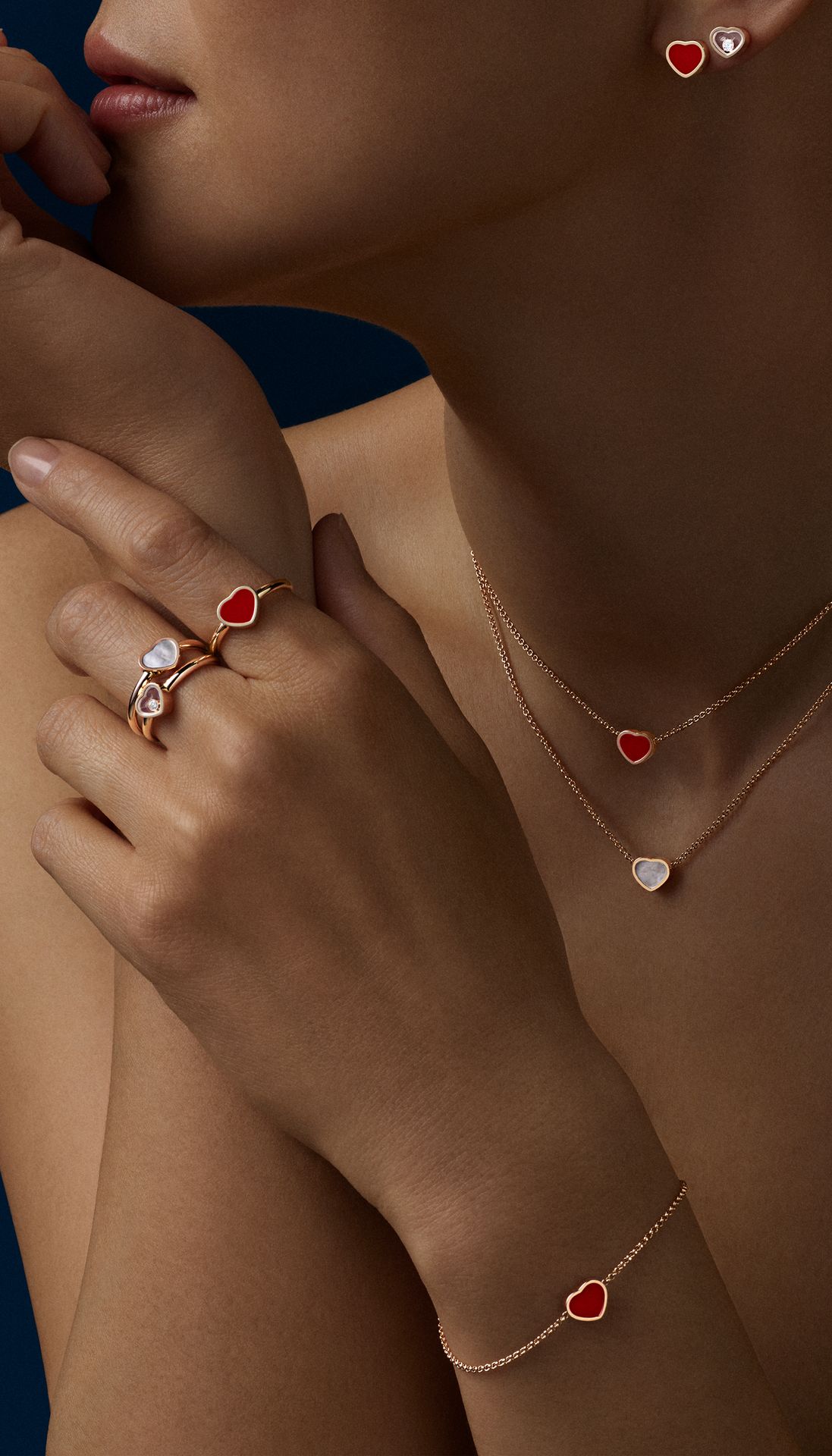 Die Schmuckkollektion My Happy Hearts übernimmt die bekanntesten Designcodes der legendären Chopard-Kreationen: das Herz und die beweglichen Diamanten. Die My Happy Hearts Diamantringe mit den Herzmotiven sind zierliche Schmuckstücke, die als stylishe Accessoires einzeln oder miteinander kombiniert getragen werden können. Me, Myself and My Happy Hearts.