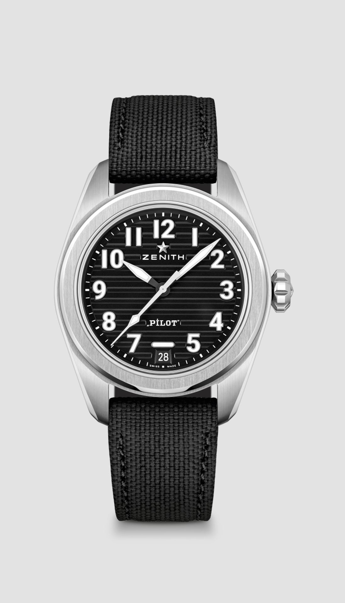 Die PILOT Automatic ist die Vorlage für die neue Generation der ZENITH PILOT Uhren. Sie verfügt über ein 40-mm-Gehäuse aus Stahl mit übergroßer Krone und ein schwarzes gewelltes Zifferblatt mit großen arabischen Leuchtziffern. Im Lieferumfang enthalten sind austauschbare Armbänder aus schwarzem Kautschuk mit Cordura-Effekt und braunem Kalbsleder. Angetrieben vom automatischen Hochfrequenzmanufakturwerk El Primero 3620.