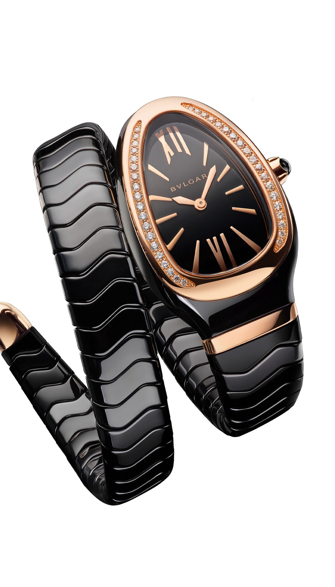 Serpenti Spiga watch with quartz movement, 35 mm black ceramic curved case, 18 kt rose gold bezel set with brilliant cut diamonds, 18 kt rose gold crown set with a cabochon cut ceramic element, black lacquered polished dial, black ceramic single spiral bracelet with 18 kt rose gold elements.