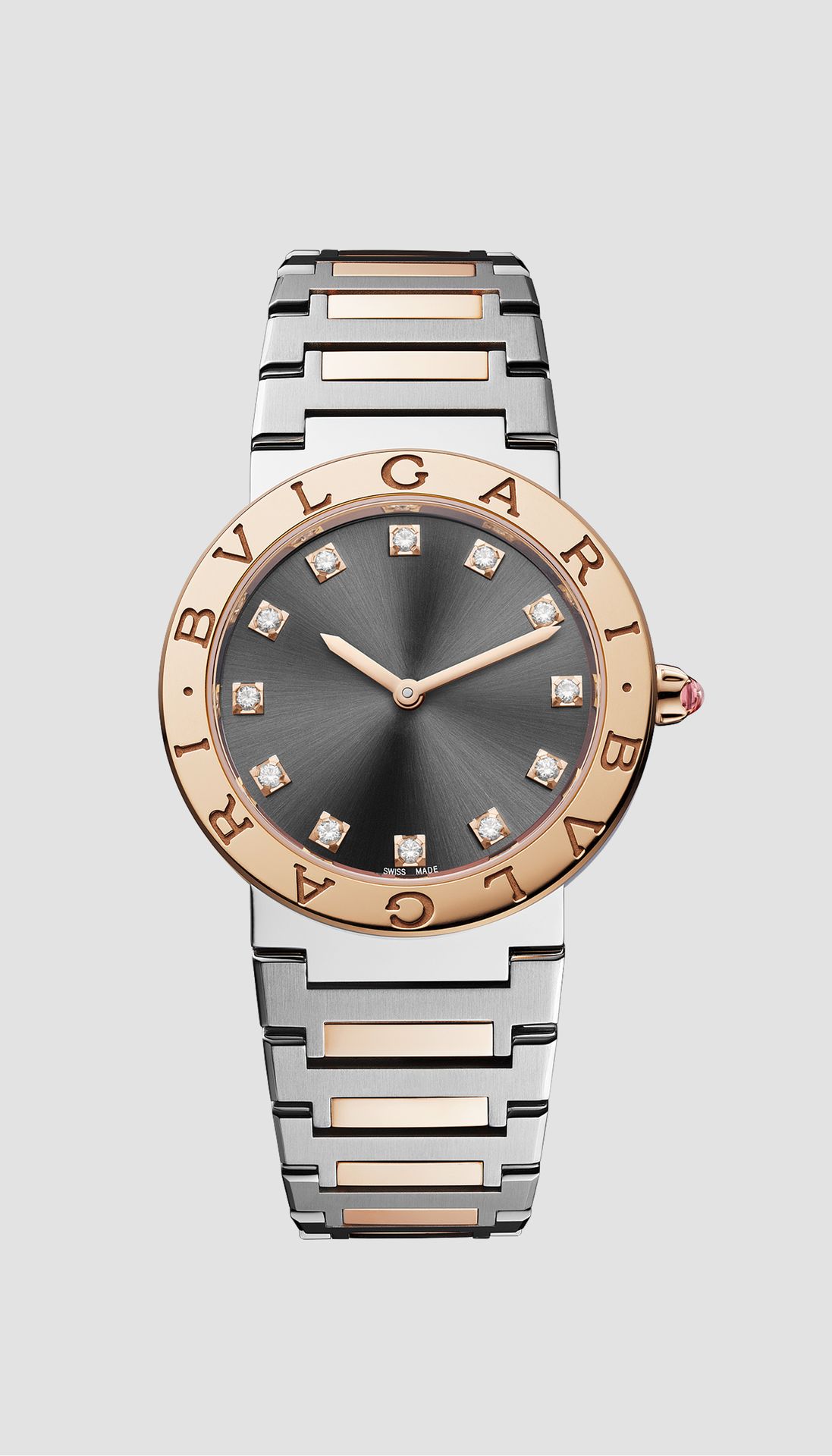BVLGARI BVLGARI LADY watch with quartz movement, 33 mm stainless steel case, 18 kt rose gold bezel with logo, 18 kt rose gold crown set with a pink cabochon-cut stone, grey lacquered dial, diamond indexes, and stainless steel and 18 kt rose gold bracelet.