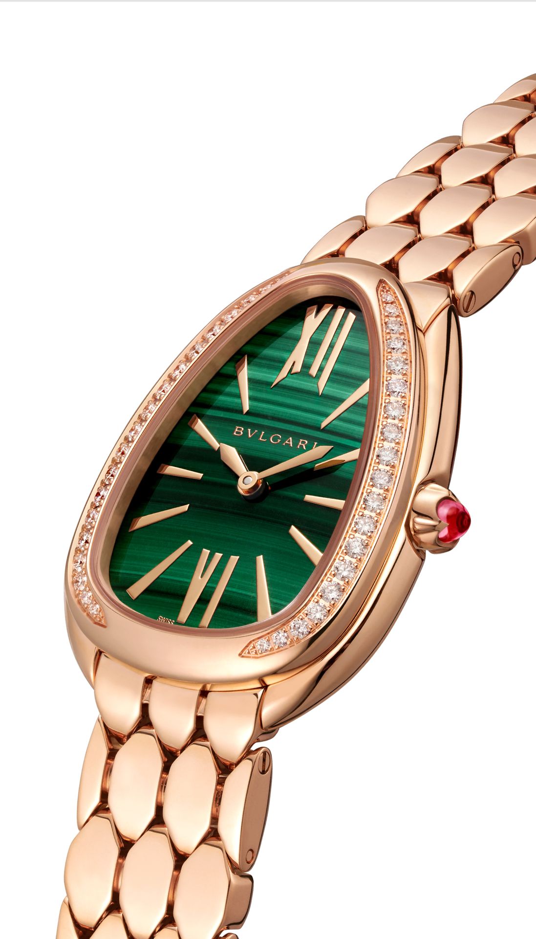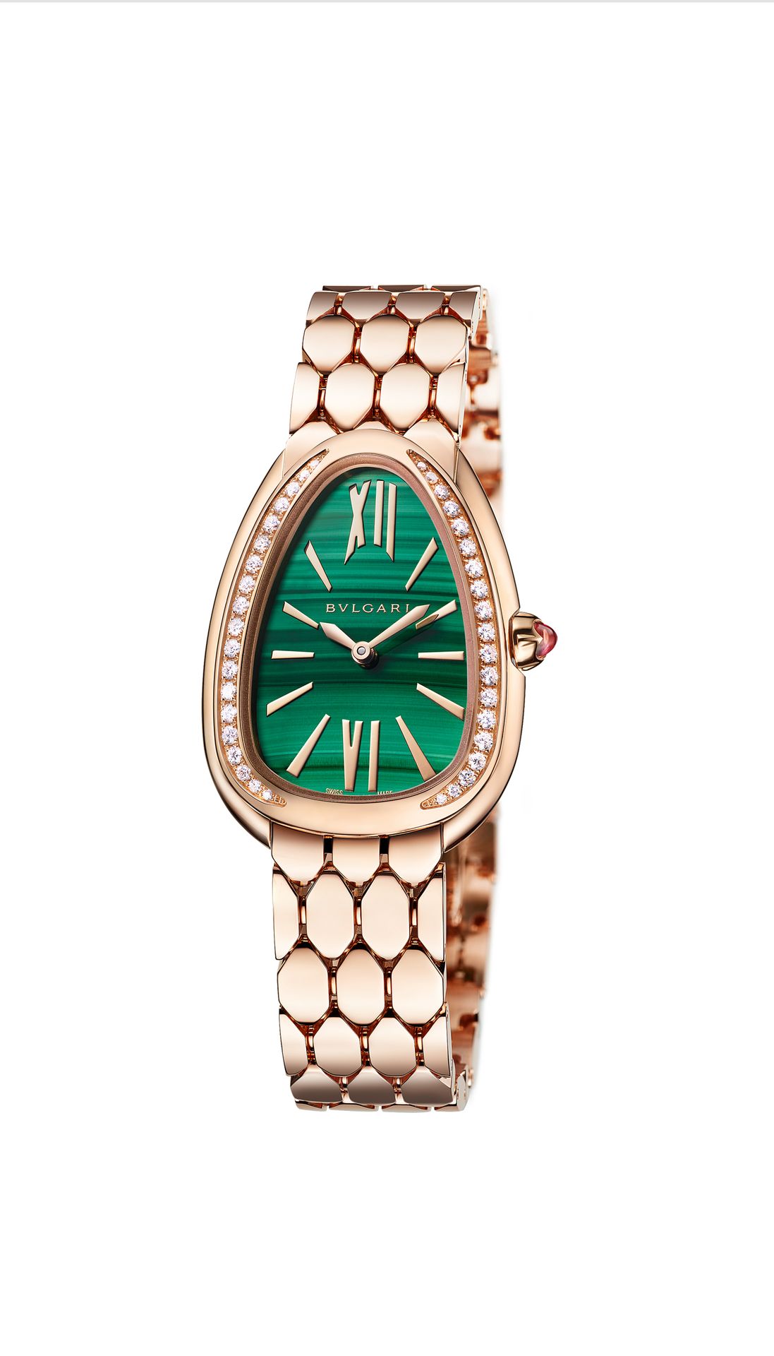 Serpenti Seduttori watch with quartz movement, 33 mm 18 kt rose gold case set with diamonds, 18 kt rose gold crown set with a cabochon-cut pink rubellite, malachite dial and 18 kt rose gold bracelet. Water-resistant up to 30 metres.