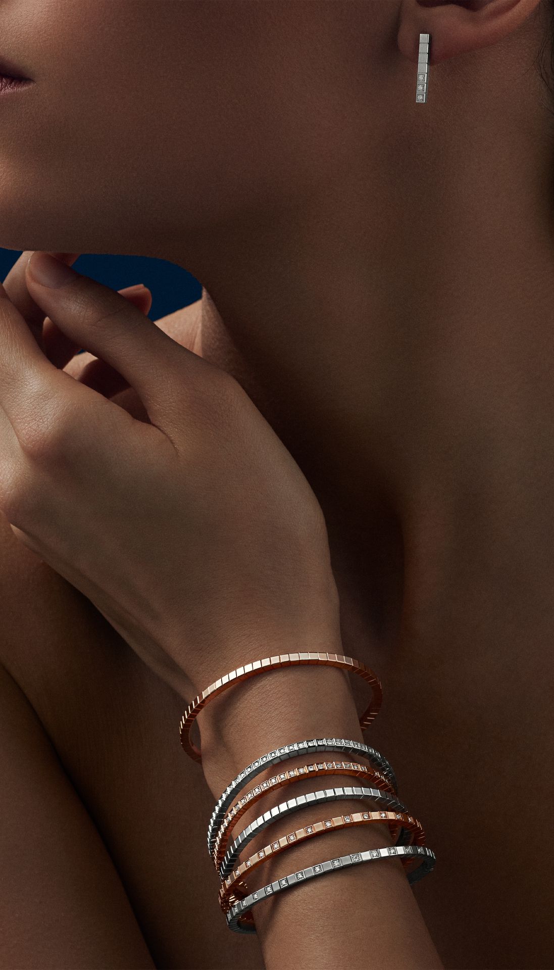 The Chopard Ice Cube collection is synonymous with quintessentially contemporary jewellery and its pared-down, deliberately androgynous graphic and rectangular shapes overturn traditional jewellery-making conventions. Created in 1999 as an assembly of small graphic cubes, Ice Cube offers a range of luxurious jewels: symmetrical rings, earrings, necklaces and bracelets subtly mingling gold colours and light effects.