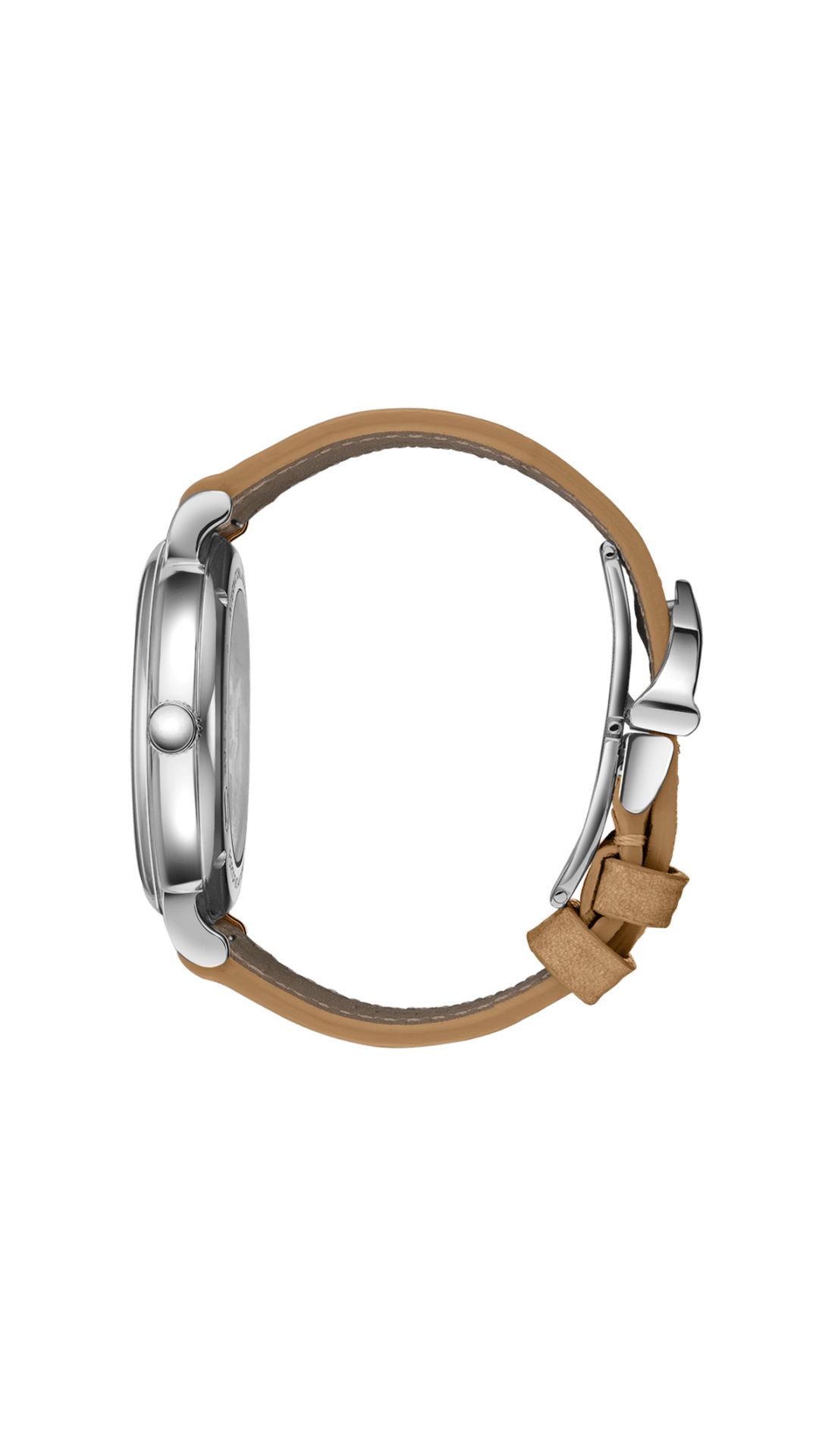 This ladies’ watch is fitted with a beige strap made of fully traceable Swiss calf leather. The strap has a natural and soft finish and boasts a contemporary, luxurious feel. Thanks to the integrated quick-change system, the strap can be exchanged easily