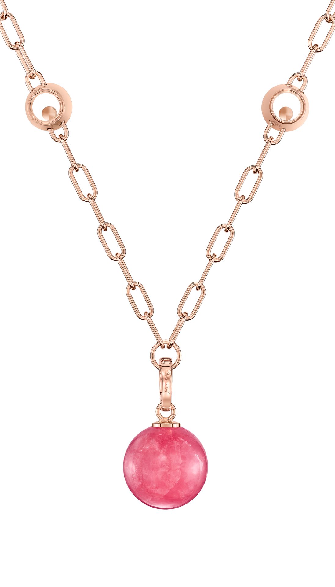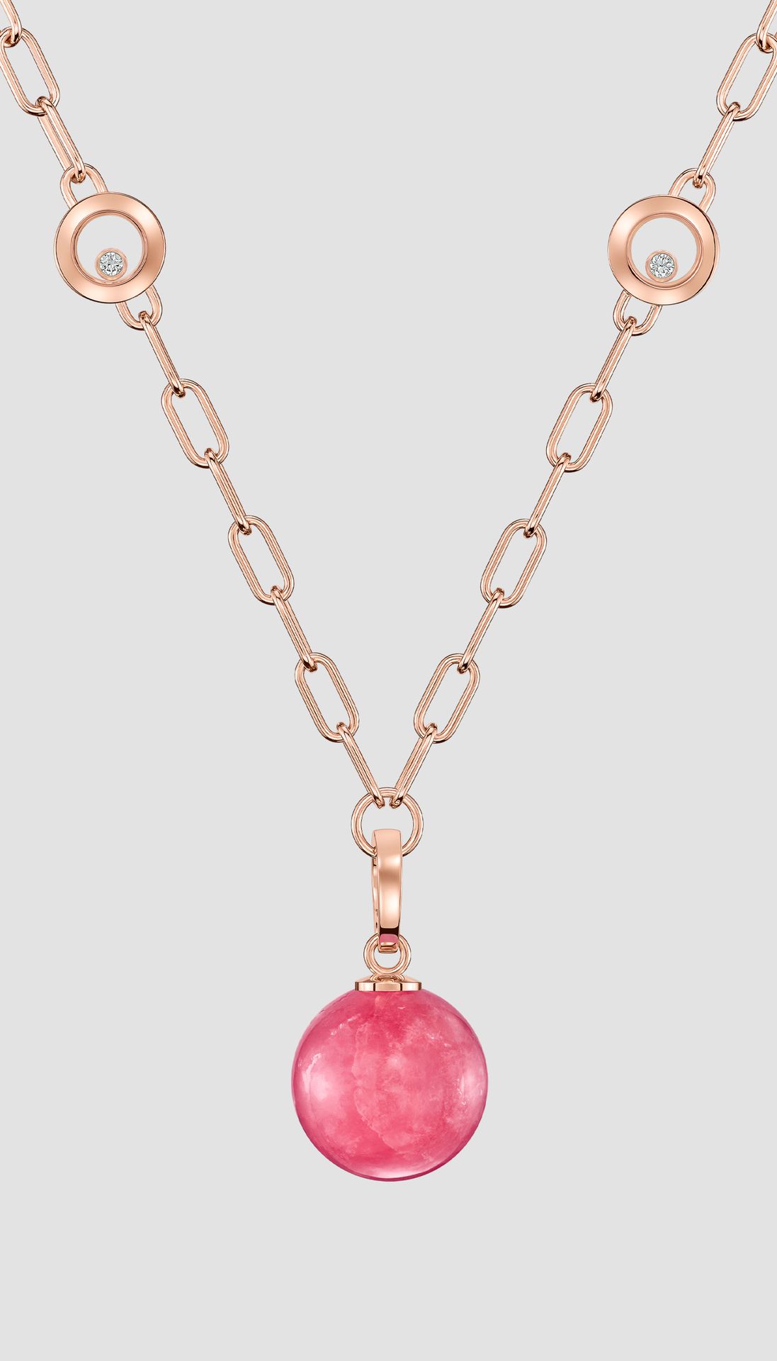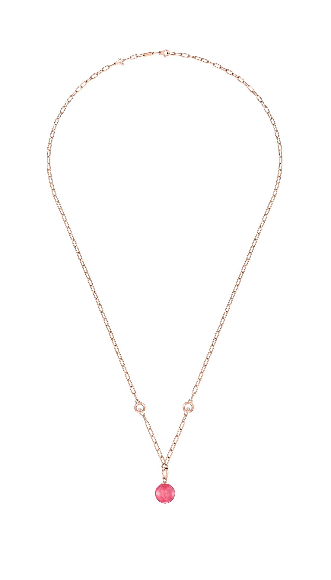 The Happy Diamonds rhodochrosite and diamond pendant is as unique as it is playful. The dancing diamonds are entirely free between two sapphire crystals, thus enabling them to move without restraint, and through this very movement to enhance their inherent sparkle. Little Diamonds Do Great Things.