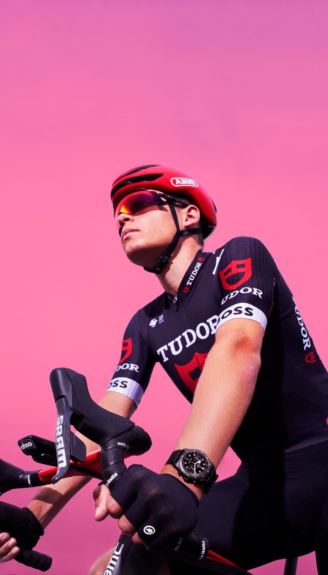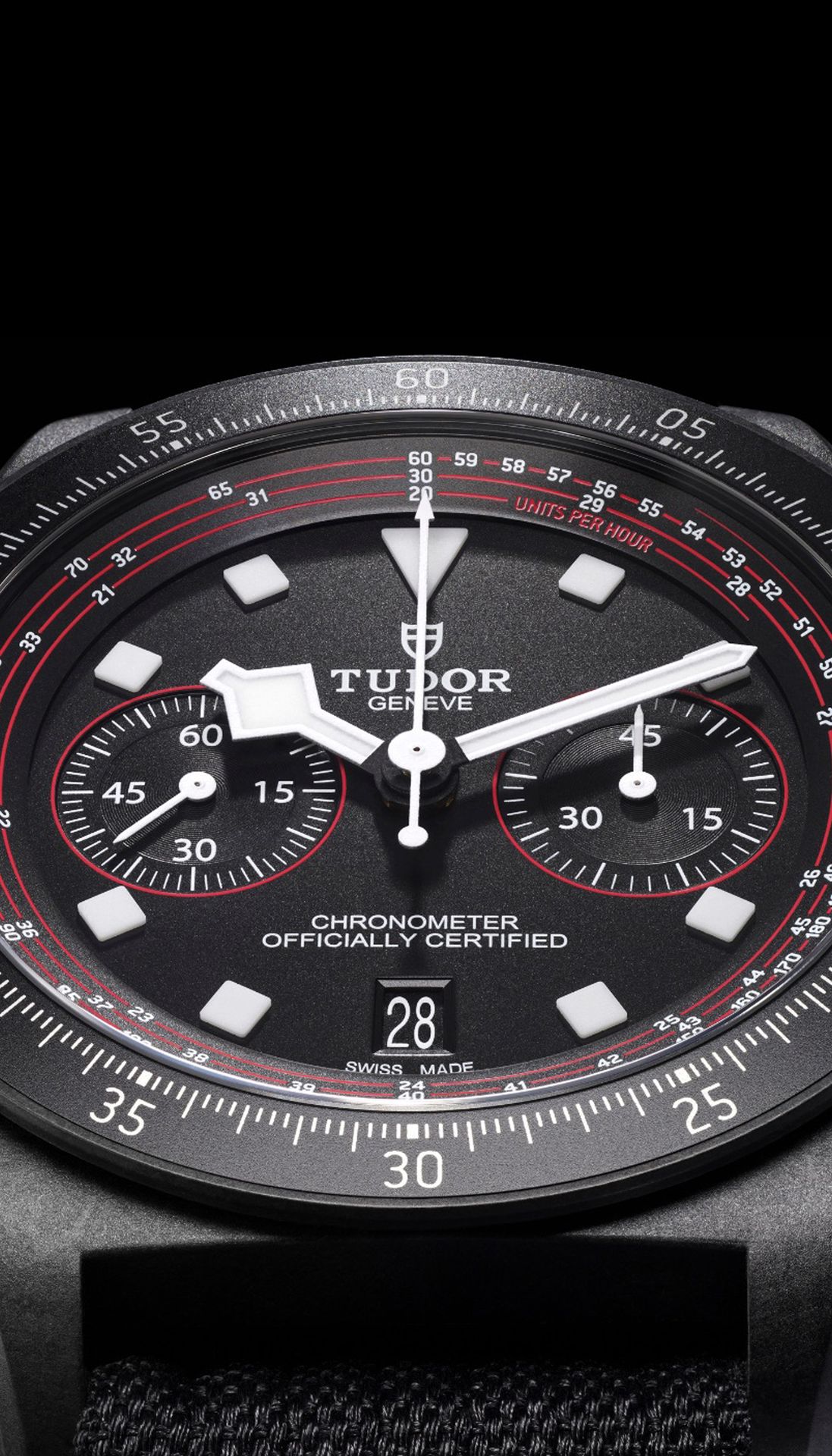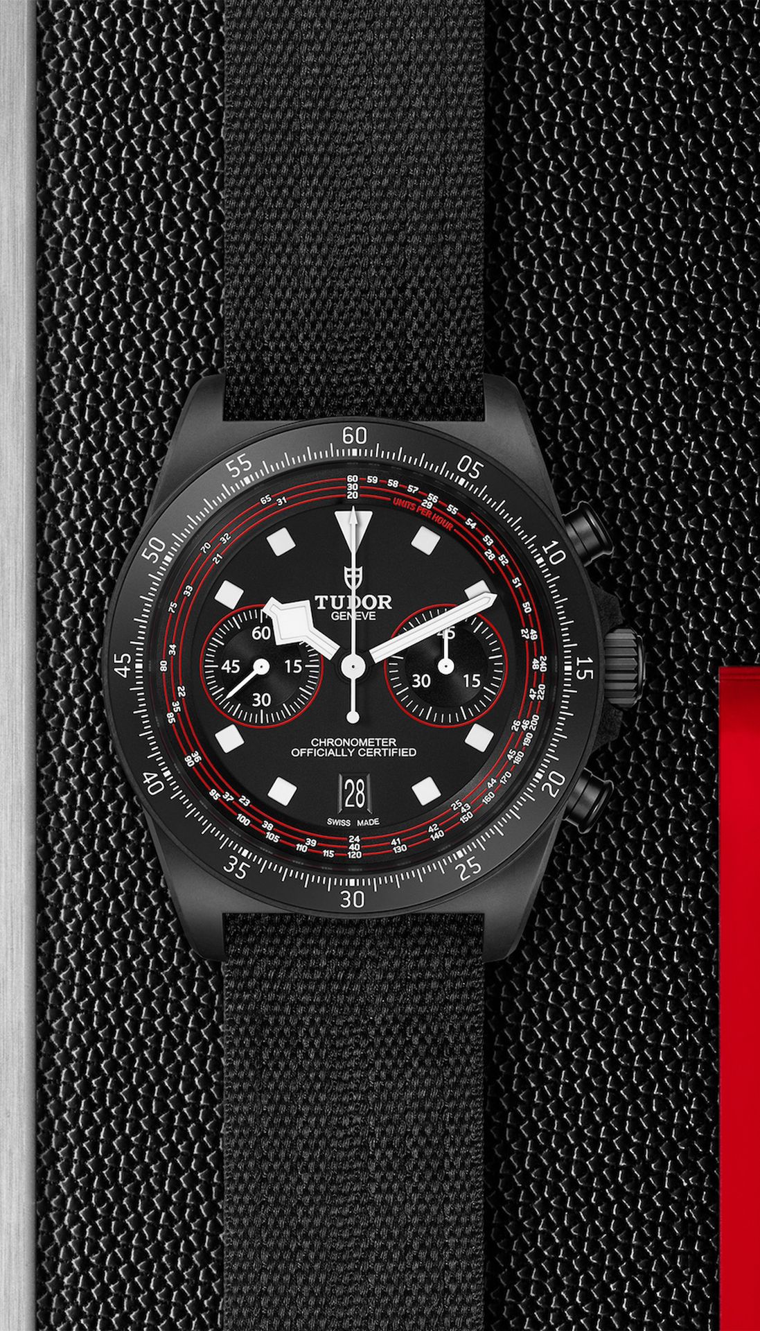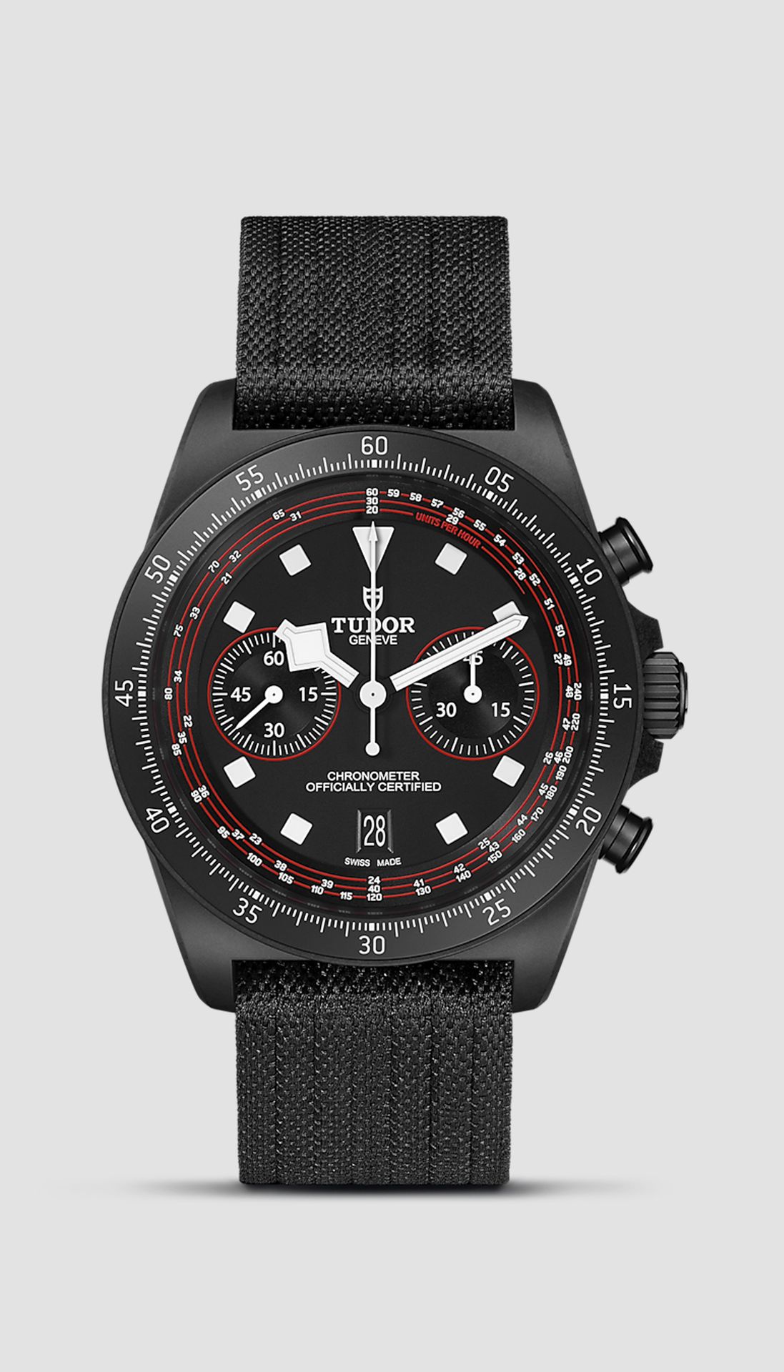 The matt black dial with red accents puts legibility first and foremost and is reminiscent of the TUDOR Pro Cycling Team colours. The signature square hourmarkers and “Snowflake” hands, designed back in the sixties by TUDOR to offer larger luminous surfaces and thus improve legibility, are fashioned from luminescent ceramic composite for optimal legibility in challenging conditions. Around the circumference of the dial, printed on a 45°-angled rehaut, is a re-calibrated tachymeter scale whose inner ring focuses on the speeds that cyclists ride at.