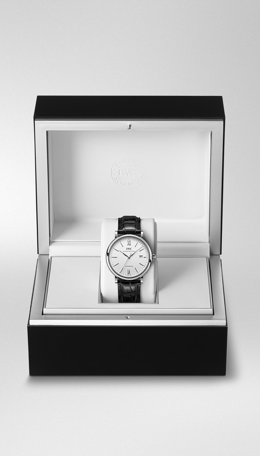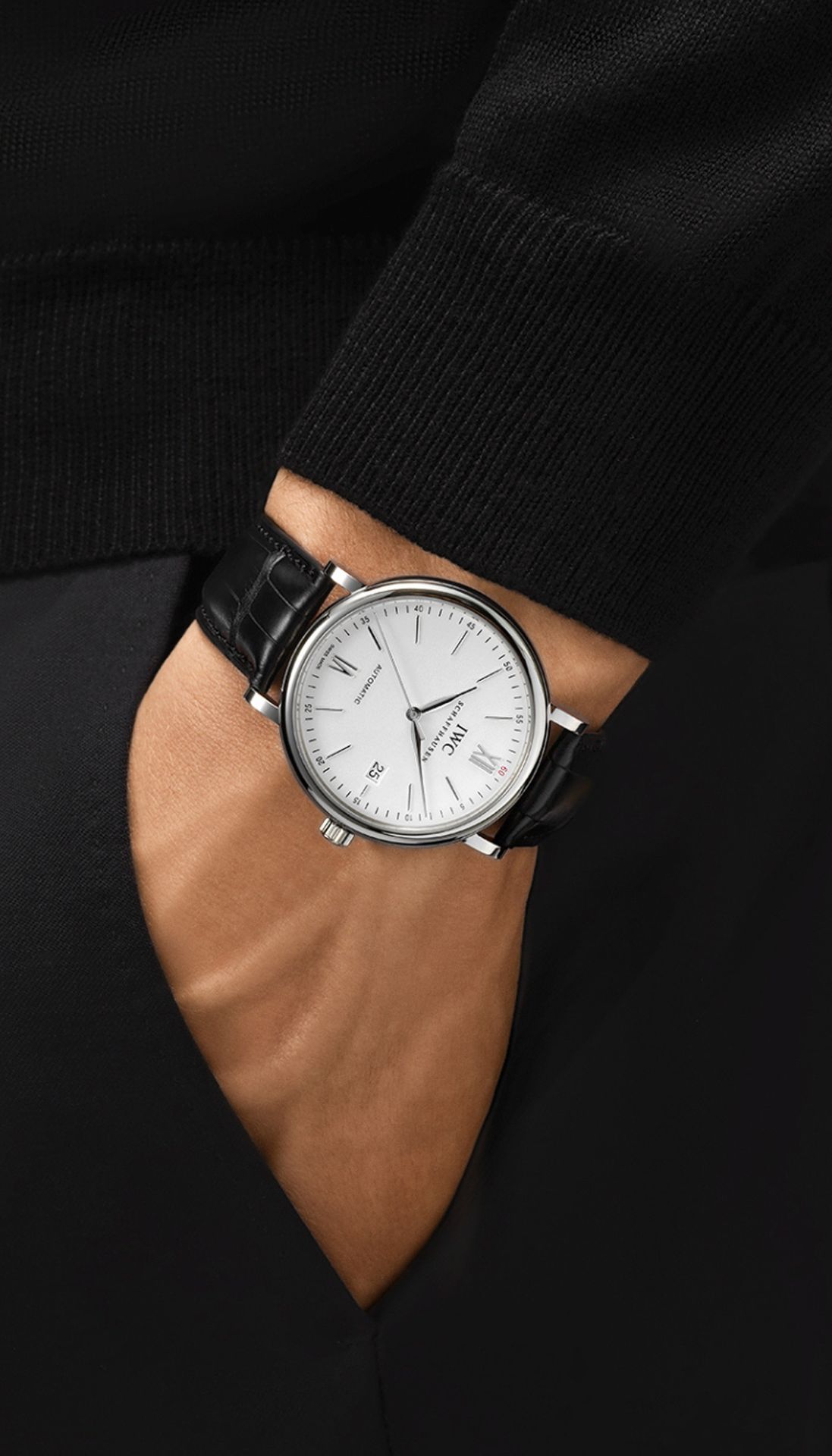 The Portofino Automatic with a silver-plated dial and black alligator leather strap is optionally available with a Milanaise mesh bracelet in stainless steel.